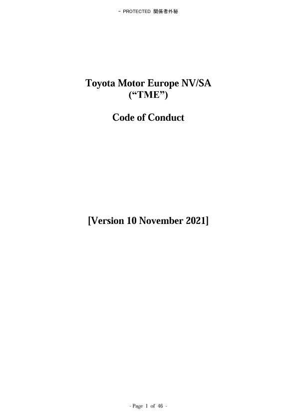TME si prizadeva poslovati z najvišjimi standardi integritete. Toyotin kodeks ravnanja ureja osnovna stališča, potrebna za ljudi, ki delajo v podjetju in v družbi, ter zagotavlja opis osnovnih ravnanj. Prav tako podrobno opisuje, kaj se zahteva od zaposlenih in kaj je treba upoštevati. Skupaj s Toyotino potjo 2020 je bistveno, da vsak zaposleni izvaja vodilna načela in izpolnjuje svojo družbeno odgovornost.